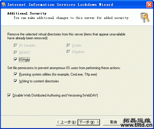 点击“下一步”,进入最后一个IIS Lockdown的选项对话框Additional Security,如图四所示,通过这个对话框可以删除不需要的目录,禁止未经授权的用户访问文件系统。IIS安装好之后会有许多用于开发和学习的虚拟目录,正式向用户提供服务的环境不需要这些目录,IIS Lockdown将删除图四对话框中选中的虚拟目录,但仍会完好地保留这些目录包含的数据。
