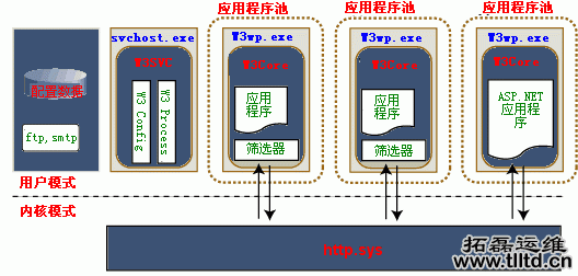 默认情况下,IIS 6.0在工作进程隔离模式下运行,如图五所示。在这种模式中,对于每一个Web应用,IIS 6.0都用一个独立的w3wp.exe的实例来运行它。w3wp.exe也称为工作进程(Worker Process),或W3Core。