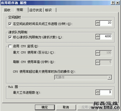 前面我们了解了IIS 6.0体系结构的关键组件,下面来看看有关应用程序池的一些问题。应用程序池的“属性”对话框有四页——回收,性能,运行状况,标识,如图六所示。在这些选项页中,最引人注目的恐怕就是“回收”页,使用该选项页可以管理工作进程的回收。在工作进程隔离模式中,IIS可以配置成定期重新启动应用程序池中的工作进程,从而更好地管理那些有错误的工作进程。这确保了池中的应用程序运行正常,并且可以恢复丢失的系统资源。为了回收工作进程,失败工作进程接收请求的能力将被限制,直到它处理完存储在请求队列中的所有剩余请求。为了排出当前请求,可以给予进程配置限制。同一命名空间组的替换工作进程在旧的工作进程停止前启动,从而防止服务中断。旧的进程完成其未决的请求,然后正常关闭,或者如果在达到了配置的时间限制、请求数、设置的时间计划,或当达到指定的内存用量限制后仍没有关闭,则明确地终止进程。默认情况下,应用程序池每隔1740分钟(29小时)回收一次。