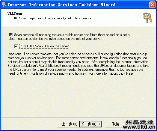点击图四对话框的“下一步”,IIS Lockdown将询问是否要安装URLScan,重庆IT外包,如图五。如果要用筛选器来禁止IIS处理某些可能有恶意的URL,即经常被黑客用来攻击系统的URL,那就可以用URLScan作为守卫IIS的前门(即筛选器)。本文不准备详细介绍URLScan,请访问http://www.microsoft.com/technet/treeview/default.asp?url=/technet/security/tools/urlscan.asp了解更多有关URLScan的说明。