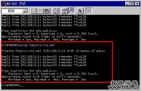 完成以上设置后,可在客户端使用Ping命令测试任意二级域名解析是否成功。例如,在命令提示符下输入“Ping fymjxcs.rtj.net”命令,得到如图所示的响应信息,就表示泛域名解析成功。