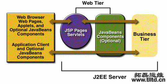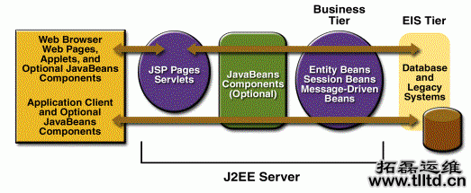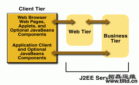 4、JavaBeans组件体系结构 服务器层和客户层也可以包含以JavaBean组件体系结构(JavaBeans组件)为基础的组件来管理在一个应用程序客户端或applet与运行在J2EE服务器上的组件之间的数据流动以及服务器端组件与数据库之间的数据流动。在J2EE规范中JavaBeans组件不被认为是J2EE组件。